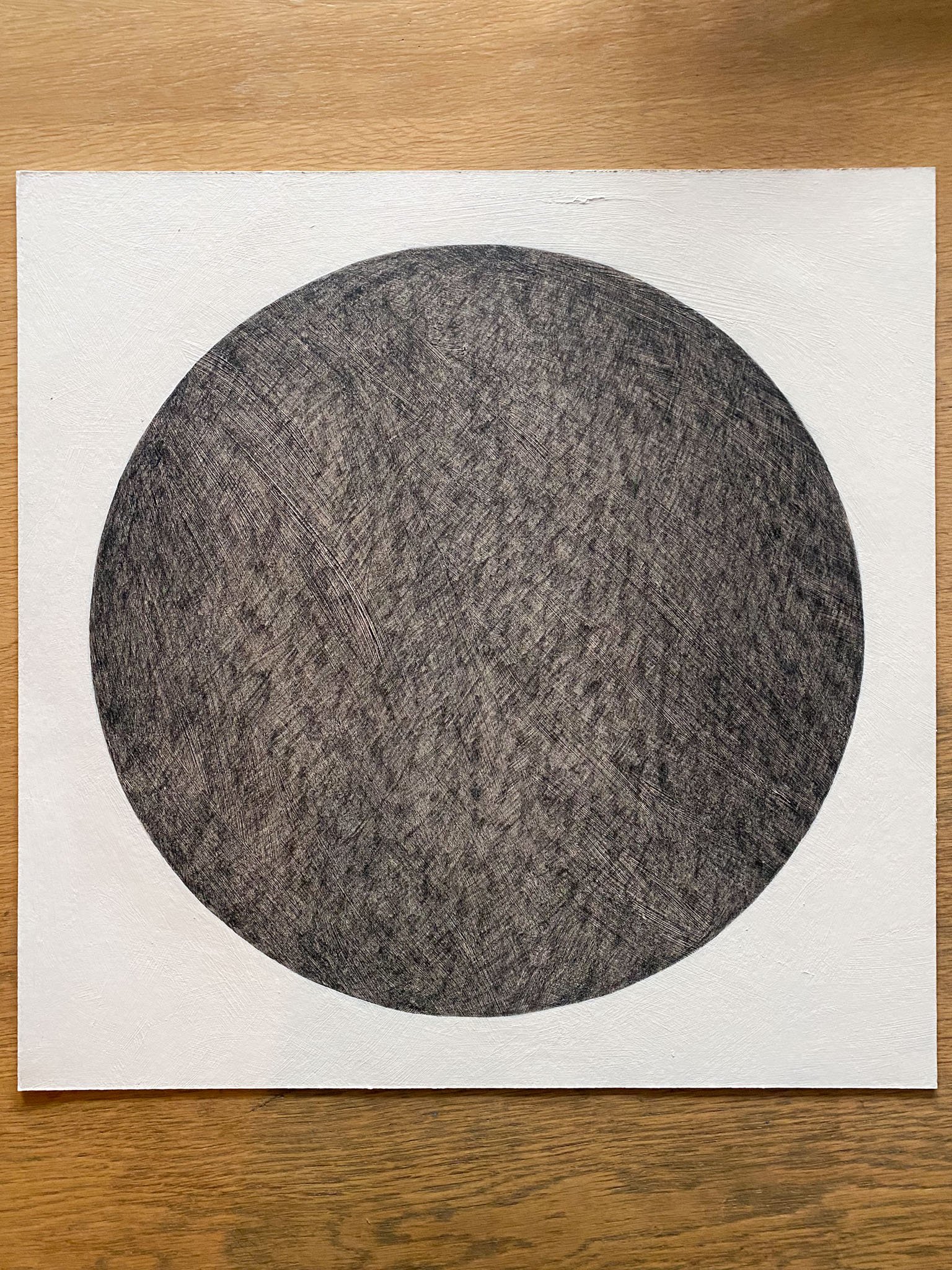 Minimalist and rich in texture, Black Moon presents a deep, gravitational circle against a serene, pale background. The dark central form draws the eye inward, revealing subtle, concentric textural patterns that reward close observation.