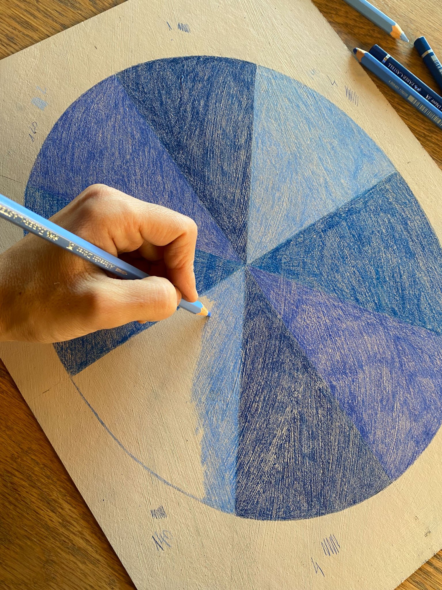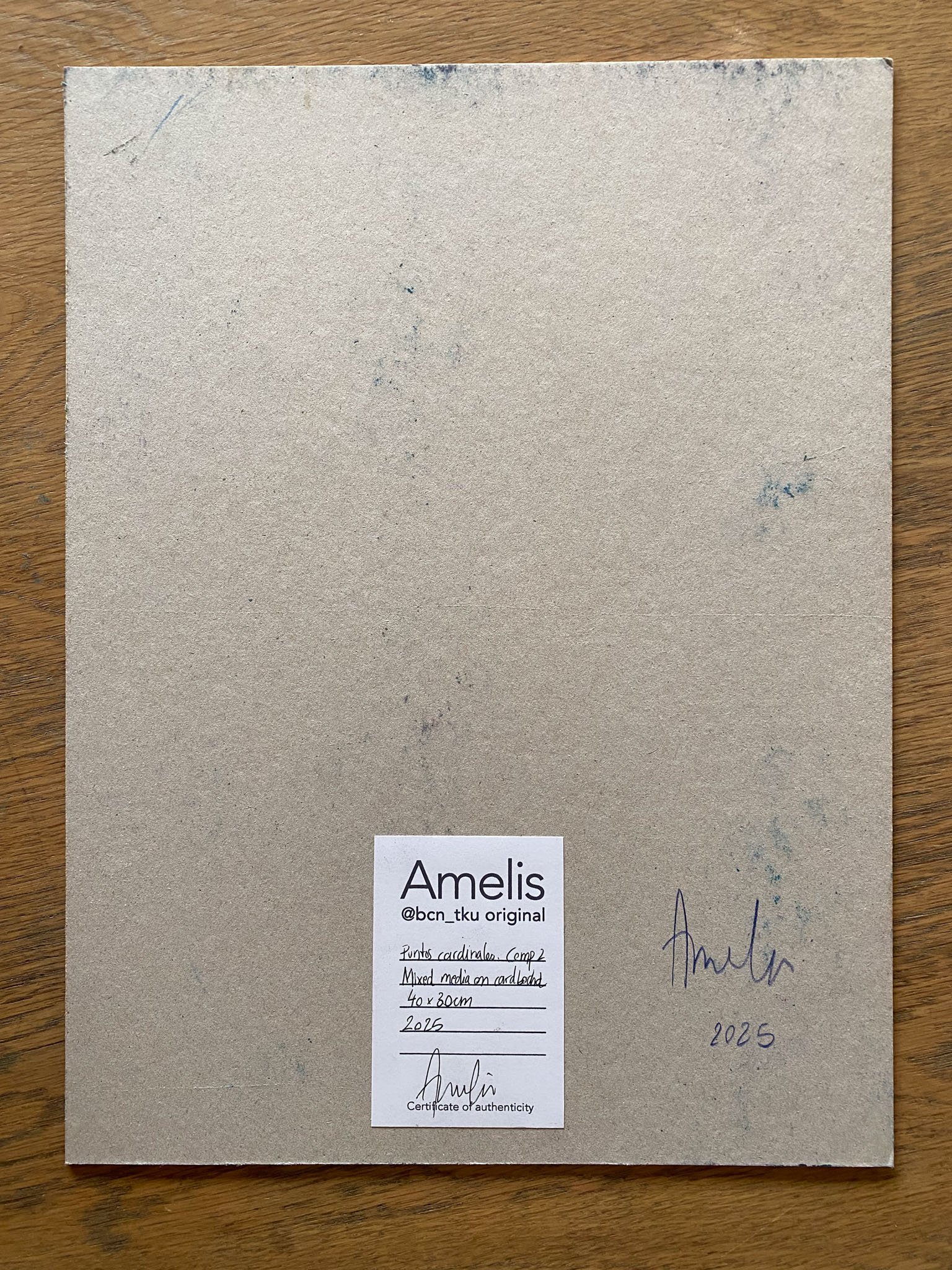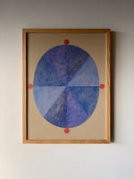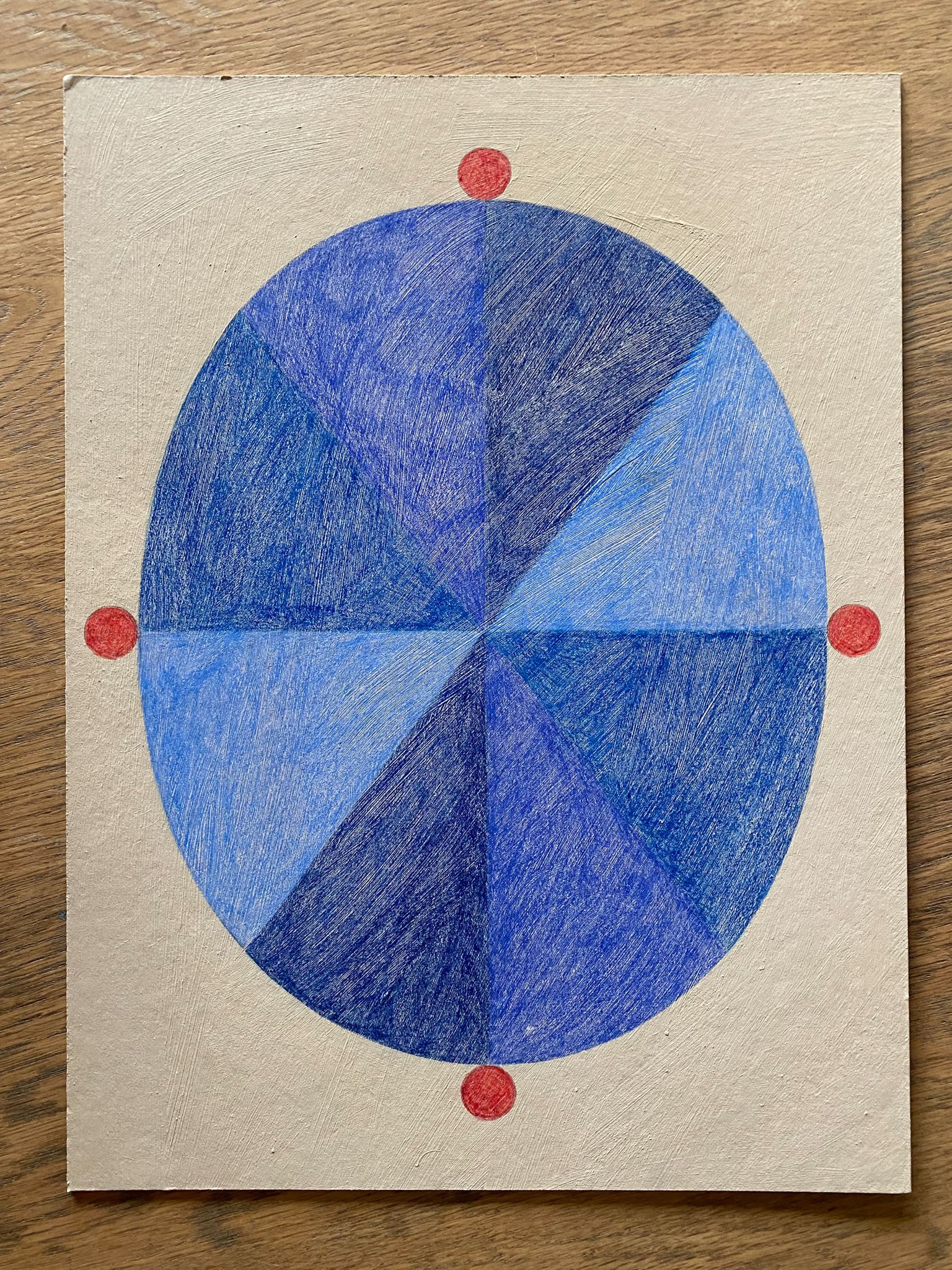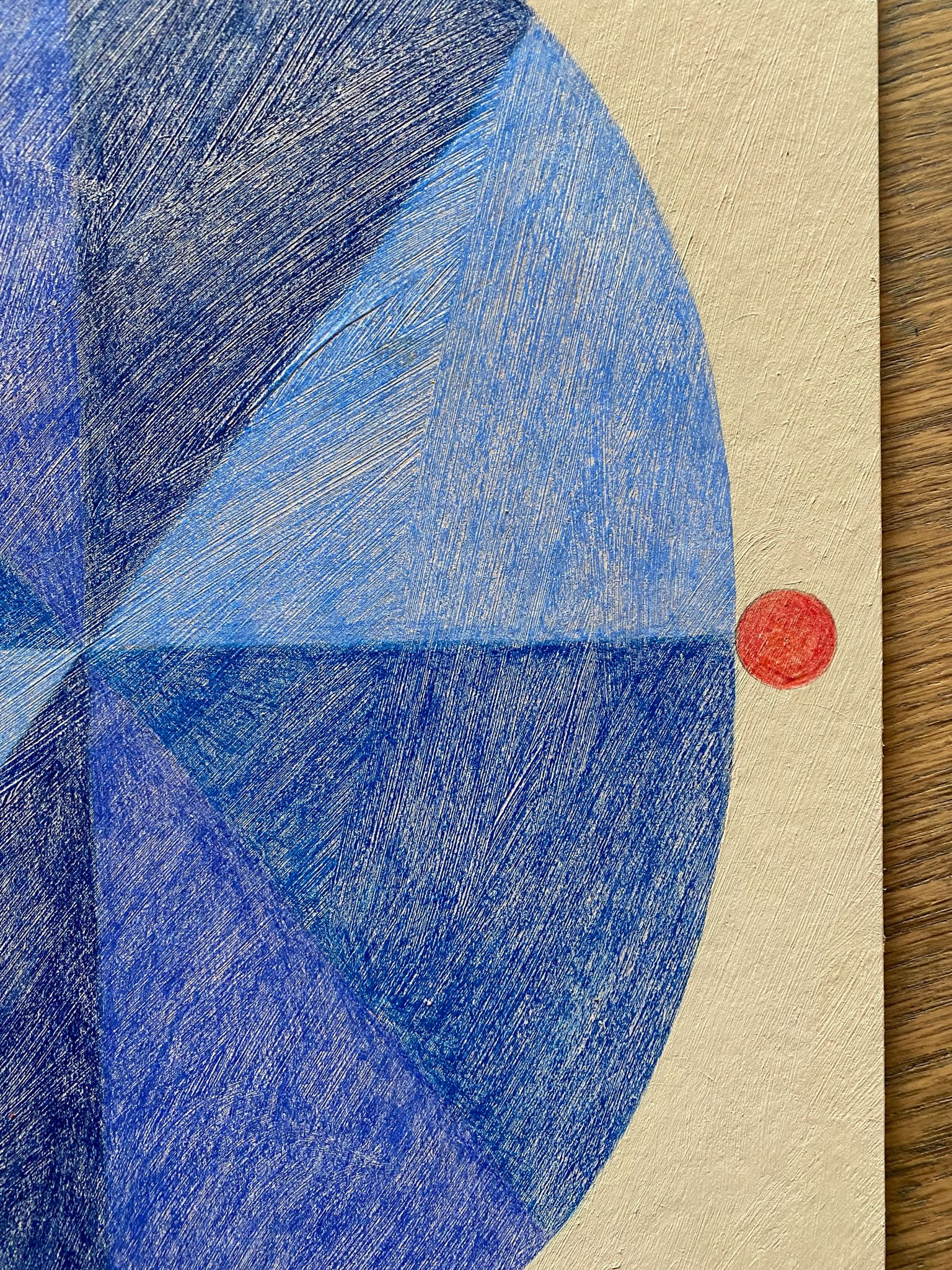 “Puntos cardinales” is a study of direction, balance, and quiet movement. Composed of an oval divided into eight hand-drawn blue segments, the piece creates a subtle rotational rhythm, as if the form were slowly turning or shifting in space. The small red circles placed at the four cardinal points anchor the composition, giving it orientation and a sense of grounding.